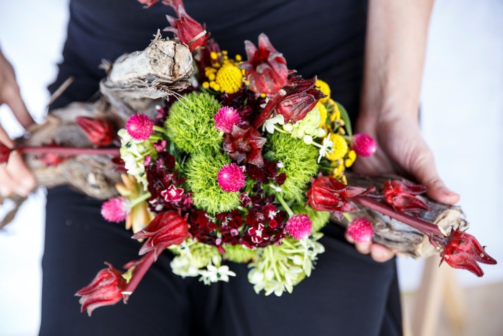 מתוך הבורדו הכהה והשפיצים החדים של ההיביסקוס מופיע לבלוב של ירוק רענן ופריחה עדינה בגווני לבן ירוק בצד אחד של הסידור וגווני ירוק צהבהב בצידו השני.